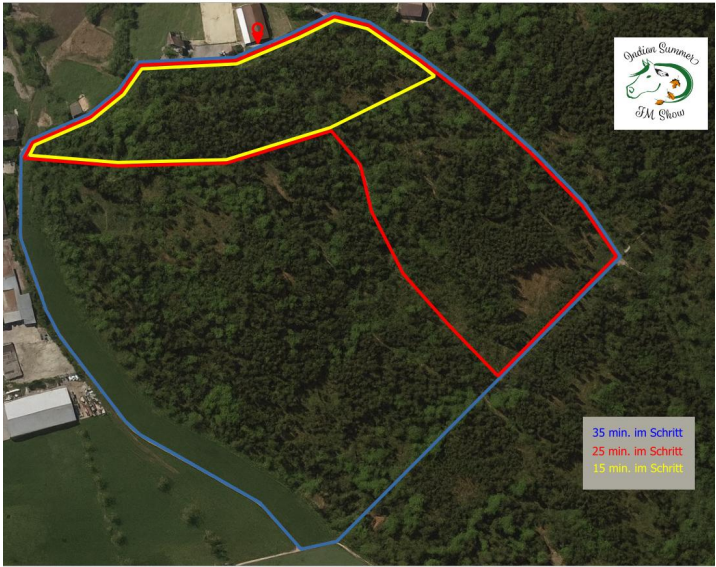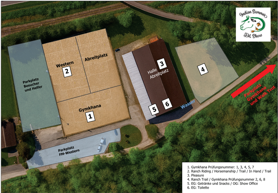 Die Parkplätze für die Walk Trott und Gymkhana Prüfungen sind auf der Wiese hinter dem Wald. Bitte haltet die Wiese sauber und werft den Mist in die Schubkarre.